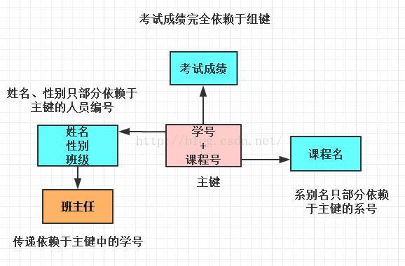 二.图形概括 eg.设一个学生关系(学号,姓名,性别,班级,班主任,课程号,课程名,考试成绩)则用函数依赖关系可以如下表示: 注:一个学生属于一个班,一个班有多名学生,一个班级有一个班主任,一个班主任只带一个班。